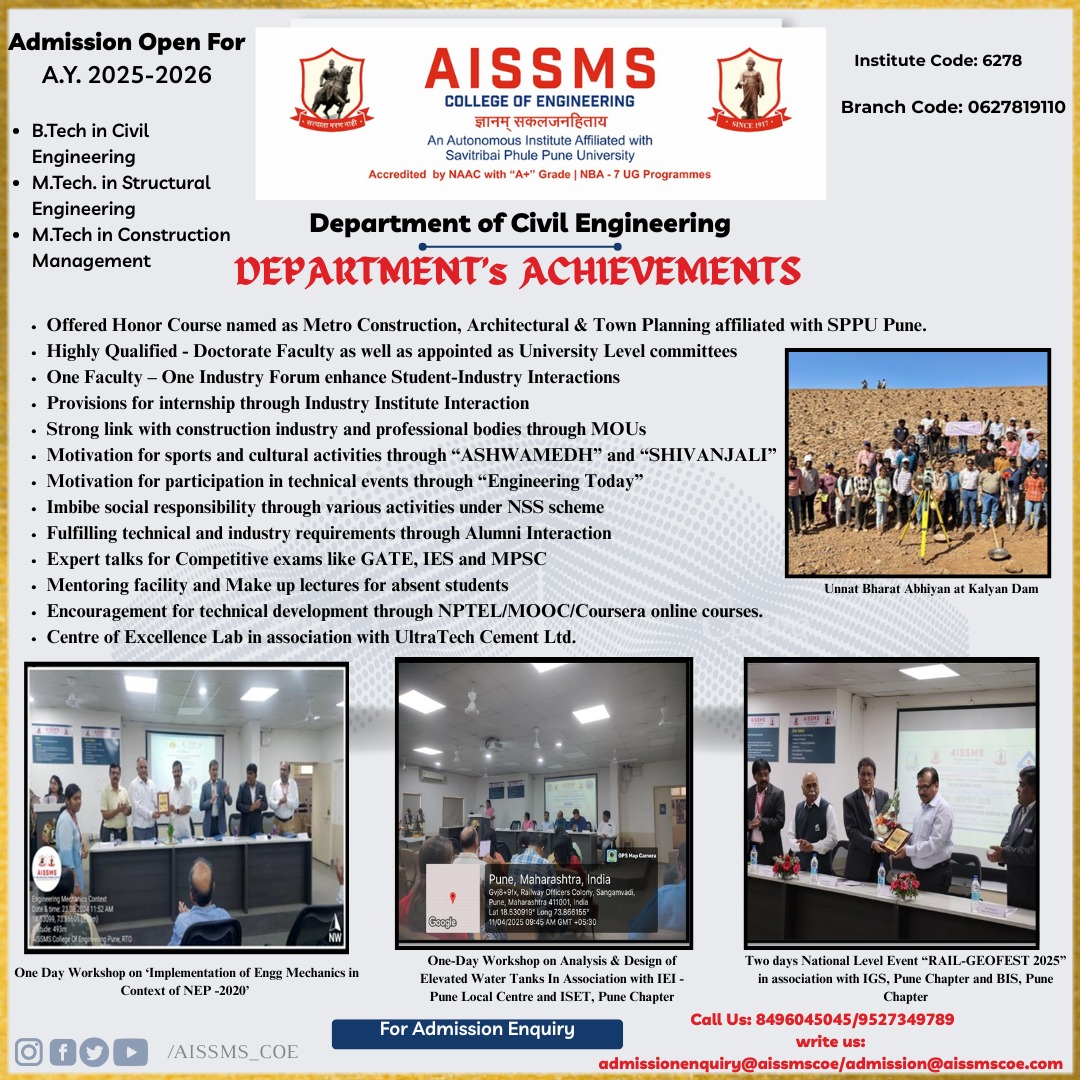 - Mr.S . Nagrale attended one week FDP on , Amplifying Proficiency in Advanced Civil Engineering organized by AISSMS IOIT, Pune, from 27th July 2020 to 31st June 2020.