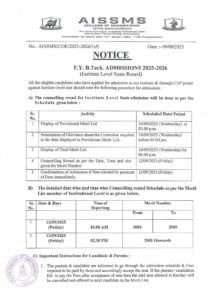 F.Y. B Tech. Institute Level Seats Admission Notice 2025-2026