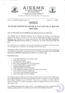 M.Tech Institute Level & Vacant Seat Round Notice 2025-26